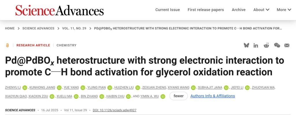 近日,beat365化学化工学院褚海斌教授团队在国际顶级期刊《Science Advances》发表学术论文“Pd@PdBOx heterostructure with strong electronic interaction to promote C─H bond activation for glycerol oxidation reaction”。该研究通过构建具有强电子相互作用的Pd@PdBOx异质结,成功地解决了甘油氧化反应C─H键活化困难、高附加值产物产率低的难题。beat365李振宇、蒋坤洪博士为该论文的共同第一作者,beat365官方网站为第一完成单位...