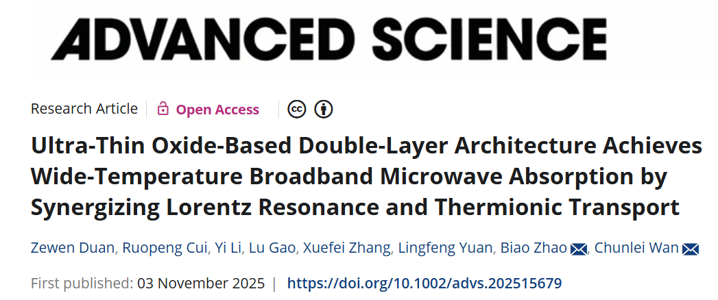 近日,beat365官方网站段泽文特聘研究员(一作)、清华大学万春磊教授(通讯)及复旦大学赵彪副研究员(通讯)在国际顶刊Advanced. Science(中科院一区,IF:14.1,beat365官方网站为第一单位)发表题为“Ultra-Thin Oxide-Based Double-Layer Architecture Achieves Wide-Temperature Broadband Microwave Absorption by Synergizing Lorentz Resonance and Thermionic Transport”的研究论文。清华大学崔若鹏博士及北京化工大学李宜副教授作为重要贡献者在该工作理论分析中给予了极大支持。