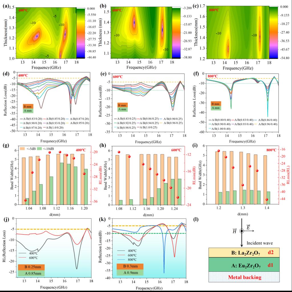 研究团队的核心创新在于选取具有八分之一本征阴离子位空位的稀土锆酸盐陶瓷锆酸镧(La2Zr2O7)和锆酸铕(Eu2Zr2O7),采用双层异质结构设计来解决上述问题。由氧离子激活的热离子弛豫极化与洛伦兹介电共振之间的平衡可以在不同温度下显著提高La2Zr2O7的介电常数实部,同时保持其稳定性;同时,强热离子传输诱导Eu2Zr2O7的介电损耗能力增加,从而有效拓宽吸收带宽(EAB)。此外,双层结构层间的宏观界面共振克服了四分之一波长理论的限制,产生了新吸收峰,从而进一步扩展带宽。在这些机制的协同耦合下,成功实现了卓越的有效吸收带宽:在超薄固定厚度仅为1.2 mm的情况下,-5 dB吸收带宽完全覆盖了Ku波段,并且在宽温度范围(400–800 °C)内实现了最大EAB/d为3.6 GHz mm−1。这种创新设计为开发超薄且宽温度适应的微波吸收材料提供了一种创新视角。