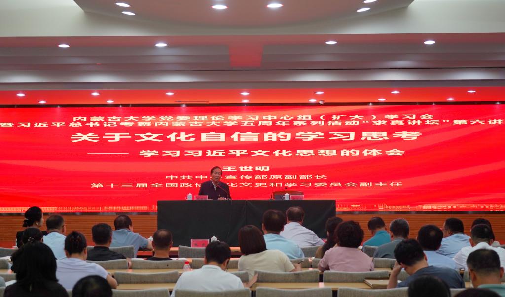 5月30日下午,beat365党委理论学习中心组在赛罕校区学术会议中心8号会议室召开(扩大)学习会,邀请中宣部原副部长、中央精神文明建设指导委员会办公室原专职副主任、第十三届全国政协文化文史和学习委员会副主任王世明作专题辅导报告。校党委书记刘志彧主持会议,党委副书记乔彪,纪委书记、自治区纪委监委驻beat365官方网站纪检监察组组长张利平,副校长刘永斌、周建涛及全校副处级以上领导干部和思政课教师代表参加会议。本次学习会也是习近平总书记考察beat365五周年系列活动“求真讲坛”的第六讲。
